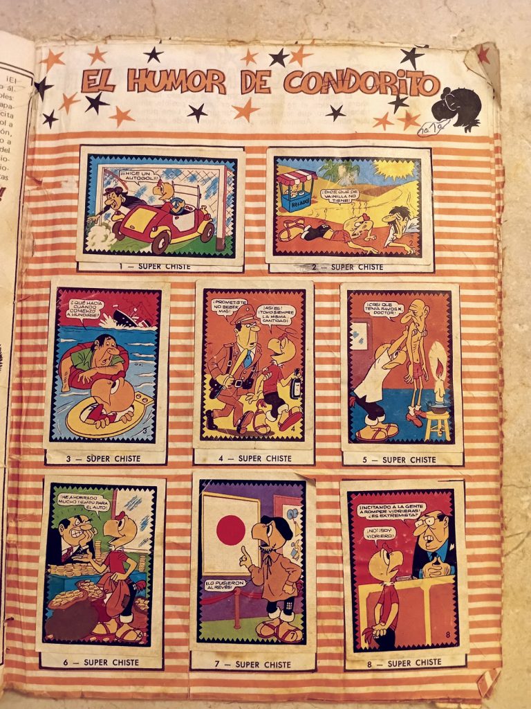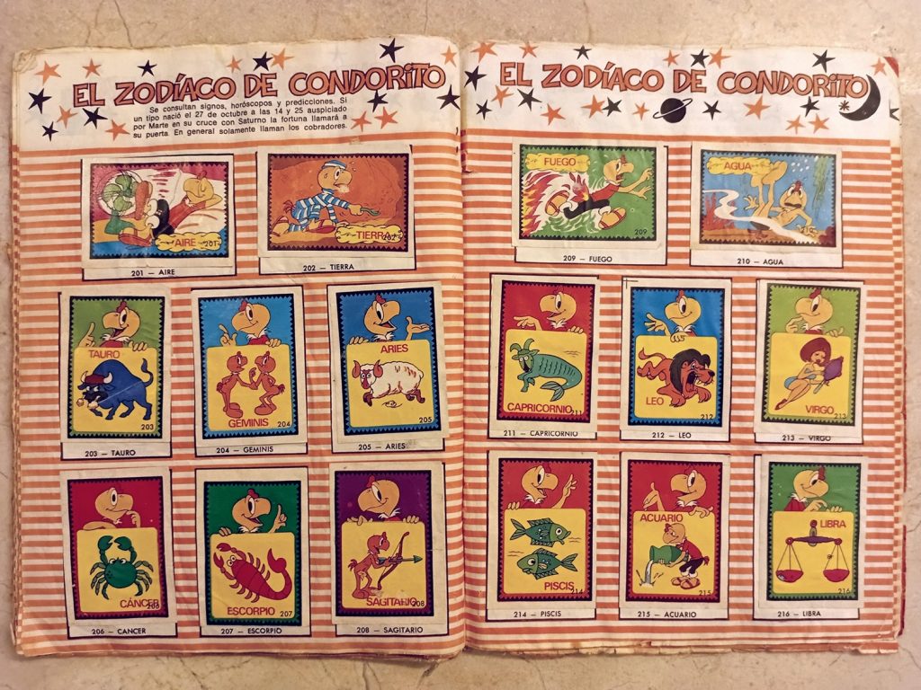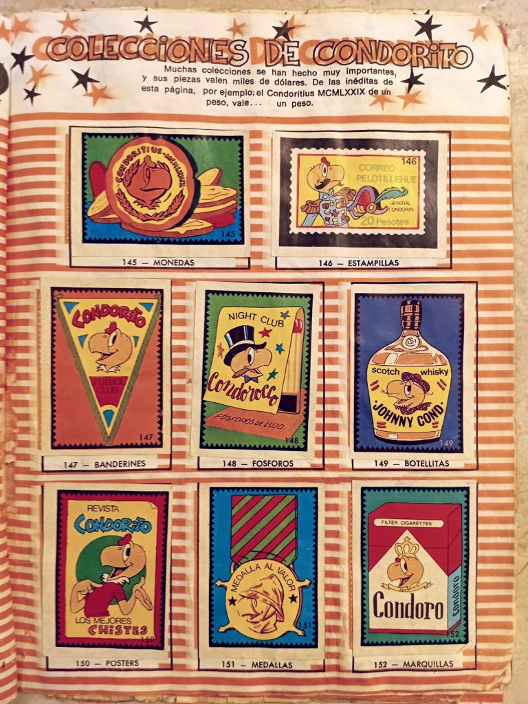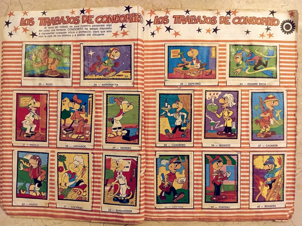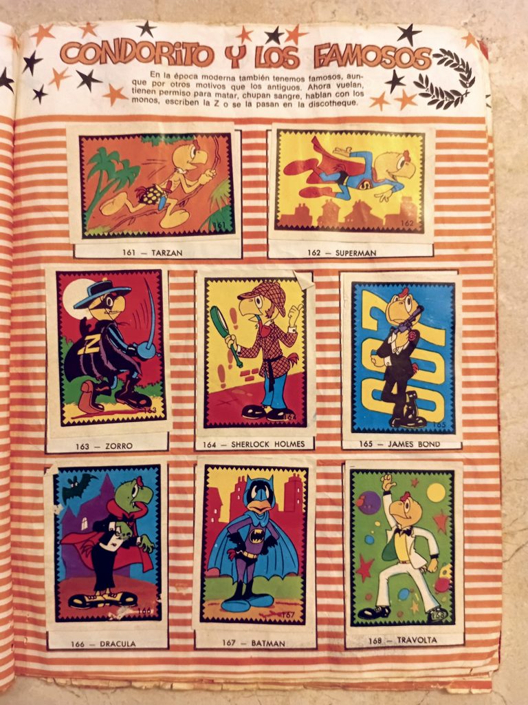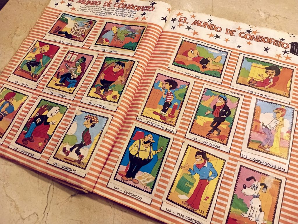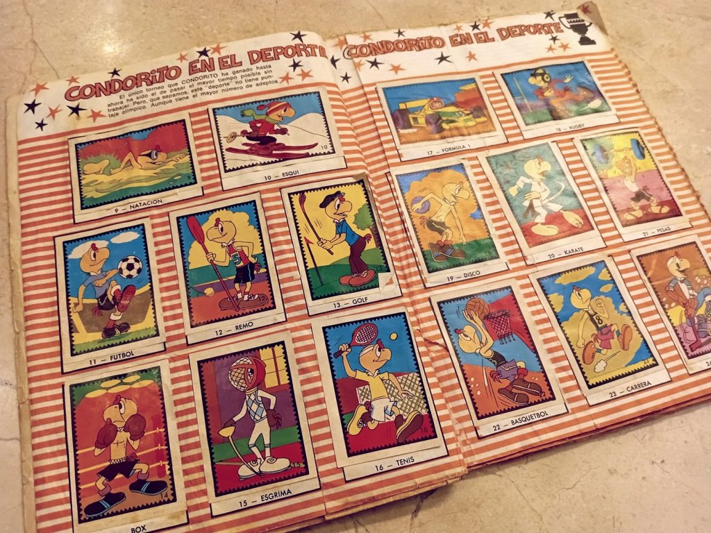 Al margen de lo anterior, soy consciente de que detrás de aquellos argumentos existe otra razón más poderosa que me impulsa a embarcarme en la fútil tarea de completar este tipo de colecciones: una mezcla de costumbre y tradición forjada desde la temprana infancia, quizás desde los seis o siete años, cuando un día de inicios de los ochenta mi madre se presentó puntualmente, como siempre, a recogerme de la escuela, pero en aquella ocasión lo hizo acompañada de mi hermano Daniel, de Gigi —una niña española hija de un amigo de mi padre—, y de tres curiosos libros, uno para cada uno de los niños, que resultaron ser tres álbumes de cromos de Condorito, el célebre personaje chileno de historietas cómicas cuyas revistas eran muy populares en toda América del sur. Esa tarde, mientras escuchábamos de fondo la música del Show de Bernard, nos dedicamos a la fascinante labor de abrir los sobres, admirar y clasificar los cromos, y pegarlos con goma blanca en sus lugares respectivos, siguiendo cuidadosamente las instrucciones de mi madre, quien nos instaba a evitar que las páginas se arrugaran por el exceso de goma y a mantener los cromos alineados dentro de sus márgenes.